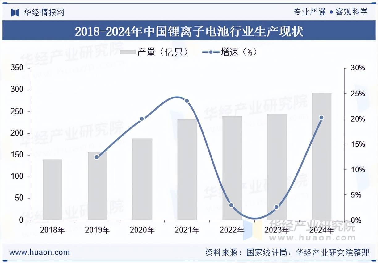 2024年我国锂离子电池产量延续增长态势,根据国家统计局数据显示,2024年我国锂离子电池产量为294.57亿只,同比增长20.1%,2018-2024年复合增长率为13.2%。