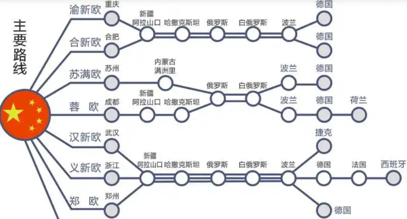 第一条线路:重庆出发,从新疆阿拉山口出国,经哈萨克斯坦,抵达莫斯科。继而转白俄罗斯、波兰,抵达德国。第二条线路,合肥出发,后面的线路和第一条一样。第三条线路,成都出发,后面的线路和第一条一样。第四条线路,武汉出发,从新疆阿拉山口出国,经哈萨克斯坦、莫斯科、白俄罗斯、波兰,继而抵达捷克、德国、法国、西班牙等地。第五条线路,郑州出发,后面的线路和第四条一样。第六条线路,义乌出发,后面的线路和第四条一样。第七条线路,苏州出发,从内蒙古满洲里口岸出国,经莫斯科、白俄罗斯,抵达波兰,继而进入德国。