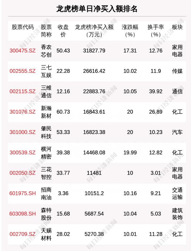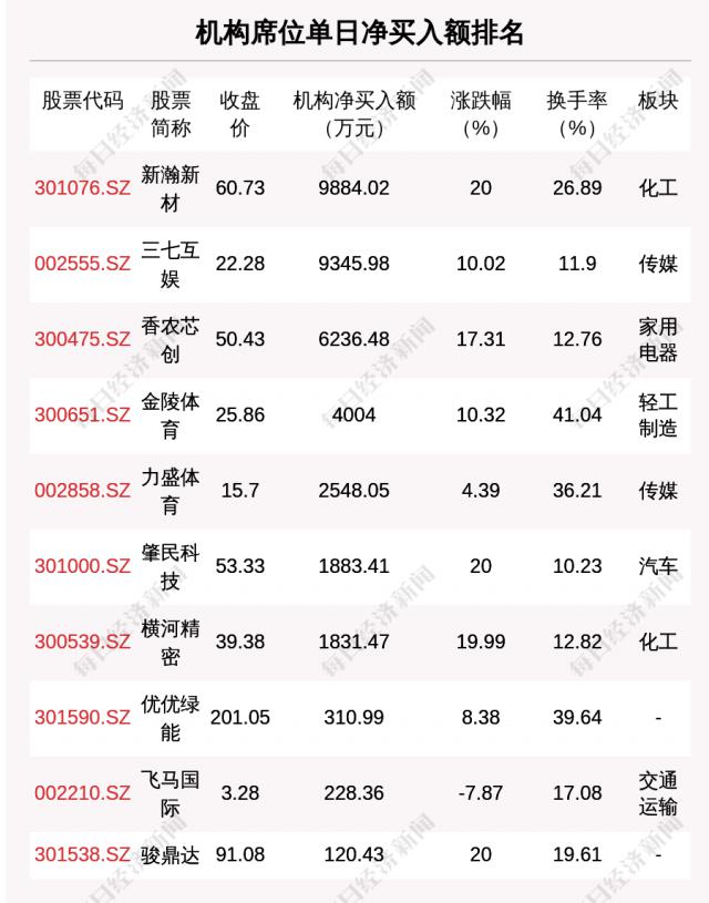 在龙虎榜中大牛配资大牛配资,涉及机构专用席位的个股有 19 只,净买入额前三的是新瀚新材、三七互娱、香农芯创,分别为 9884.02 万元、9345.98 万元、6236.48 万元。