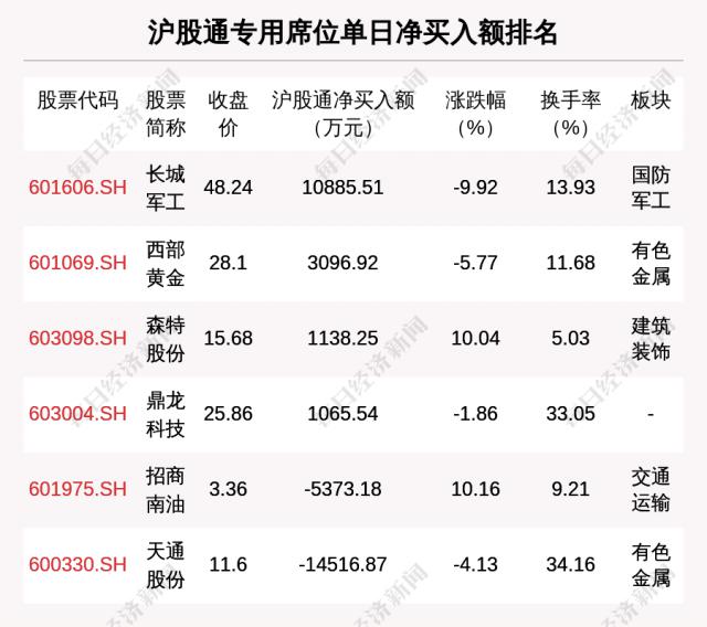 在龙虎榜中,涉及沪股通专用席位的个股有 6 只,长城军工的沪股通专用席位净买入额最大,净买入 1.09 亿元。