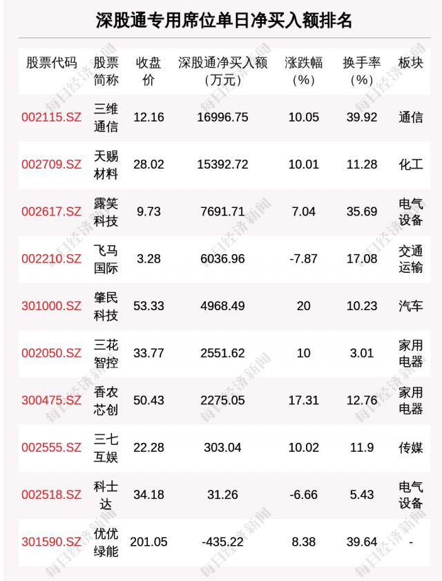 在龙虎榜中,涉及深股通专用席位的个股有 12 只,三维通信的深股通专用席位净买入额最大,净买入 1.7 亿元。