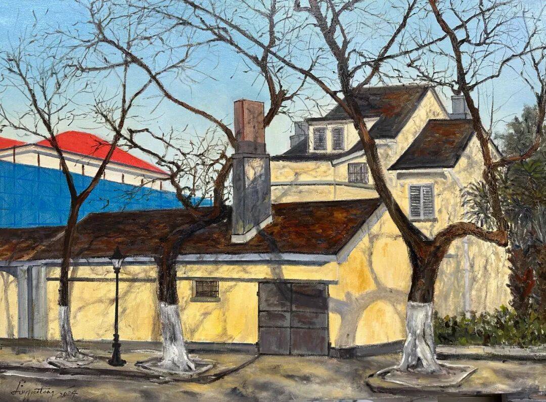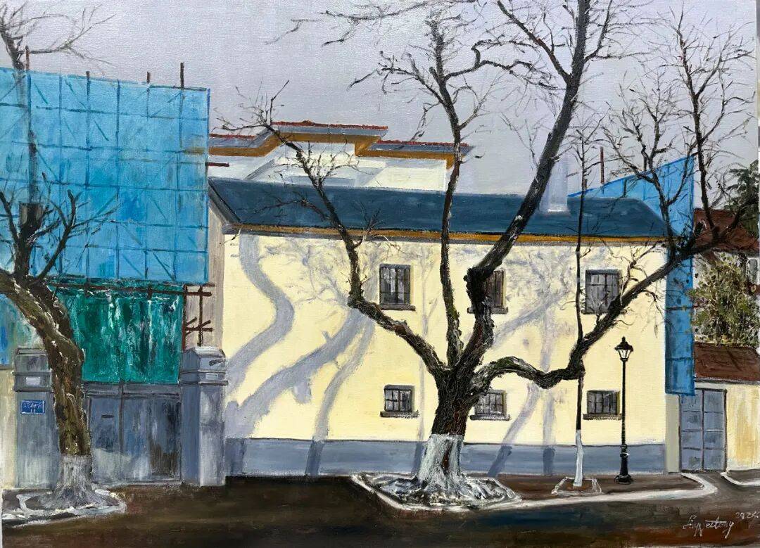 2023年9月,刘伟冬到艺术之乡巴黎小住。彼时阳光明媚,秋高气爽已在树梢凝结,一簇簇金黄和绛红色的树叶,悄然潜伏在绿荫怀抱。他踏着落叶缤纷的石板路走进奥赛美术馆,再度邂逅二十年前就一见倾心的巴黎画派的莫里斯·郁特里罗。旅行回国后他便带着郁特里罗描绘巴黎的目光书写南京的颐和路:“梧桐叶已尽数凋落,粗壮的树干根部被花木师傅涂上了白色石灰,素色中透着光的痕迹。院子里的杨树尚存星星点点的黄,远处松柏则晕染出暖橘色,为凋敝的深秋平添温度。”画家笔锋倒立,痛快淋漓,如孩童般肆意。倏然两年时光,他疯狂地画了六十多件《颐和路街景》系列作品,对日常街巷的凝视在这里化为些许追忆似水年华般的忧伤,时光被凝固,记忆被物化,色彩被交响。他的“颐和路”的宁静与郁特里罗“蒙马特街道”的孤寂隔空对话,老男人怀旧的情绪发散在梧桐树间。他试图叙说在都市空间中的存在状态与情感归属,主观与客观、历史与当下,永远不停地交织共鸣,为每个时代的亲历者筑起多重通往集体记忆与个人情愫的幽径。
